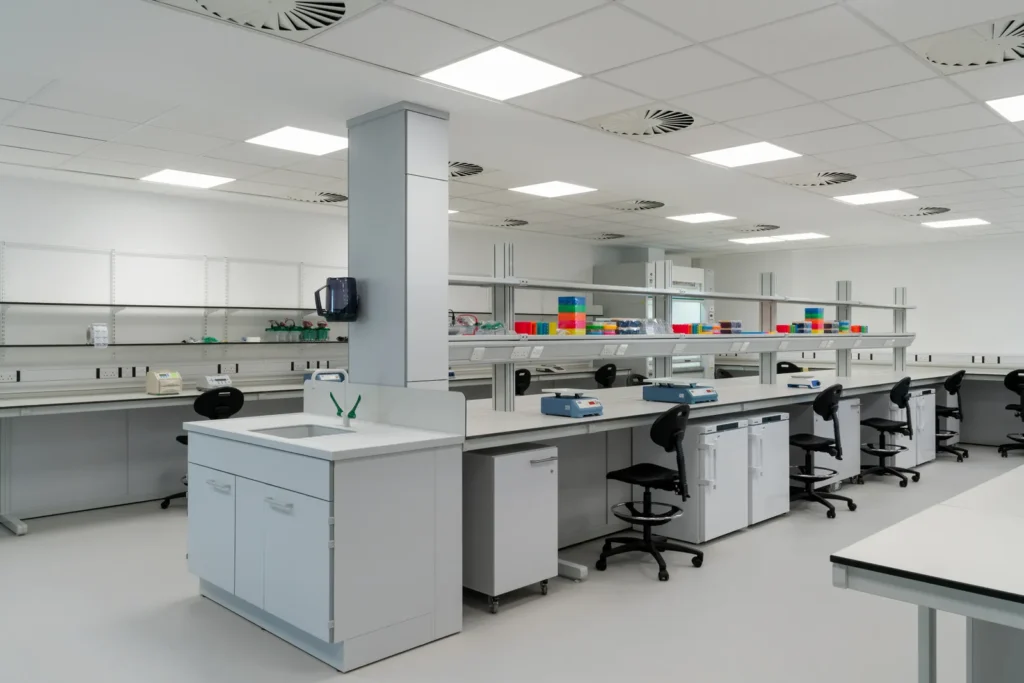 Specialized design for R&D, analytical, and quality control laboratories with proper ventilation, utilities, and safety systems.